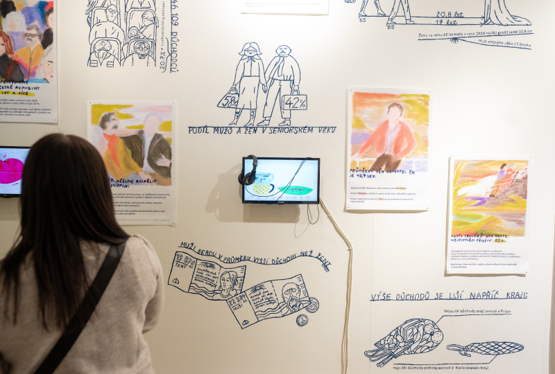 Senioři a lektoři tvůrčích dílen vystavují v rámci výstavy Co čumíš tak mladě? v Atriu Žižkov, která měla vernisáž 8. listopadu 2025.